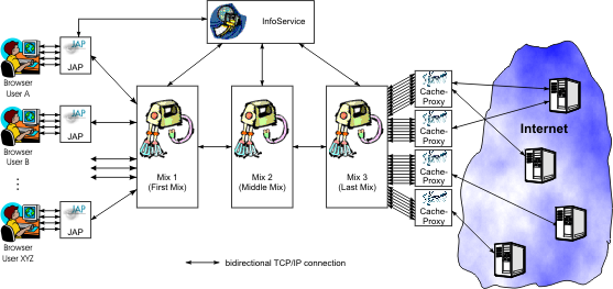 Architektur des AnonymisierungsdienstesIn folgender Abbildung wird der der Aufbau des Anonymisierungsdienstes JAP schematisch dargestellt. Er besteht aus den Kompontenten: