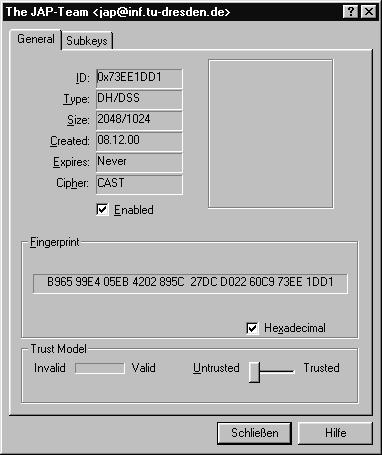 Wenn Sie Sich davon überzeugt haben, dass der Fingerprint des von Ihnen heruntergeladenen JAP-Schlüssels mit dem auf unserer Website veröffentlichten übereinstimmt, können Sie den JAP-Schlüssel signieren. Klicken Sie dazu mit der rechten Maustaste auf den JAP-Schlüssel und wählen Sie "signieren". Anschliessend wählen Sie wieder den Eigenschaften-Dialog des JAP-Schlüssels und bewegen den Schieberegler im Bereich "Trust Model" von "Untrusted" in die Stellung "Trusted". Jetzt kann mit der eigentlichen Prüfung der Authentizität der jeweiligen